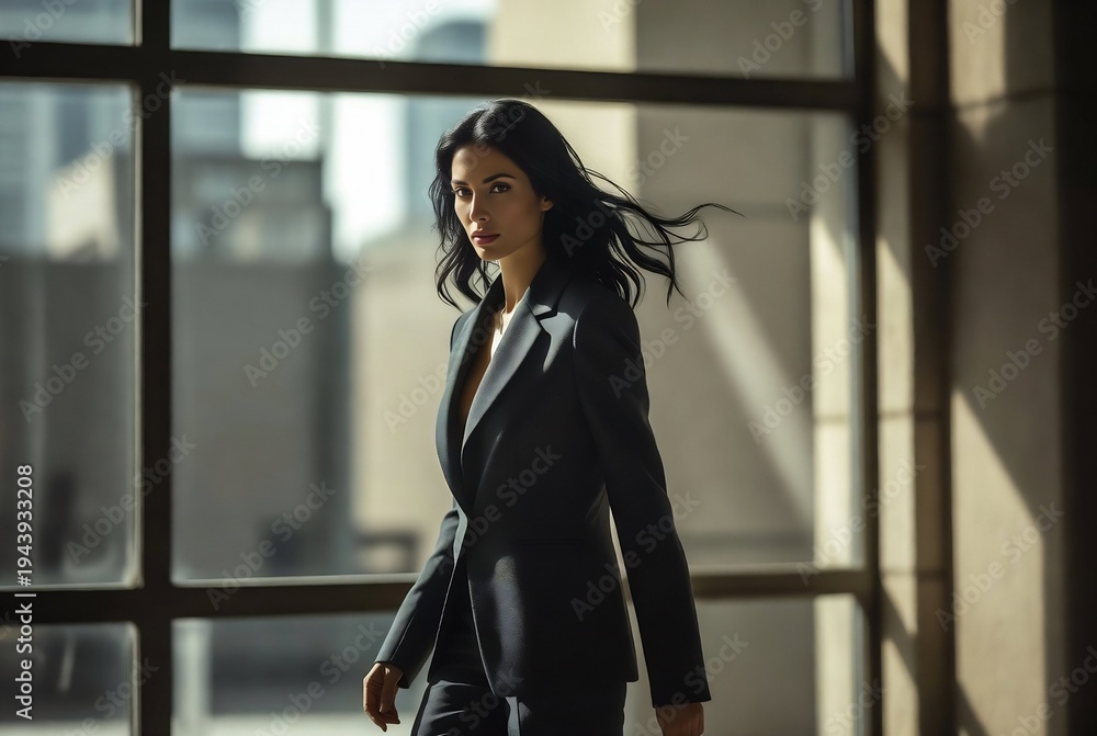 A woman in a black suit stands by a window, looking out at an urban cityscape. #1943933208