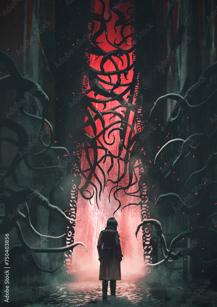 A woman in a coat standing in front of an entrance filled with strange black thorny roots, digital art style, illustration painting #750403856