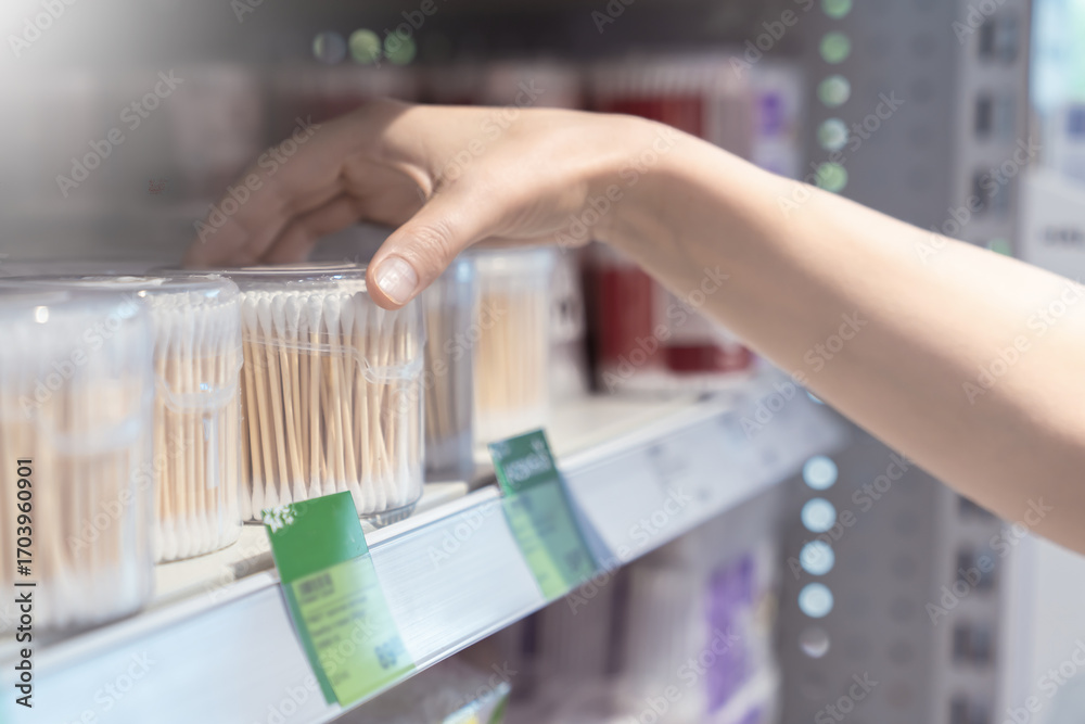 A woman takes a pack of cotton swabs for hygiene from a shelf in a store, close up hand #1703960901