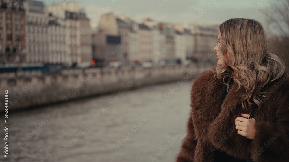 A woman wearing a brown fur coat stands overlooking the Seine River in Paris France with a cityscape background. This image is suitable for travel tourism and romantic getaway themes. #1858884004