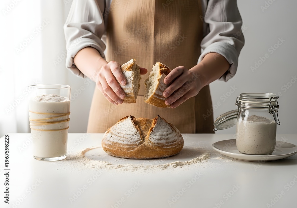 A woman wearing an apron tears freshly baked sourdough bread on a surface, showcasing the texture, with a glass of oat milk and a jar of flour to complete the scene, suggesting a homemade meal #1967598223
