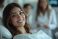 A woman with a bright smile reclines in a dental chair with blurred figures in the background. #1766534019