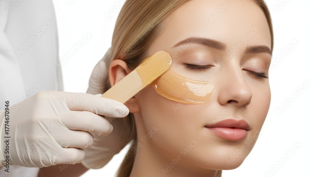 A woman with her eyes closed is getting a waxing treatment on her face. A beauty technician wearing white gloves is applying warm wax with a wooden spatula #1774670946