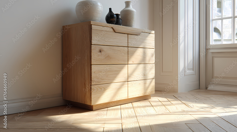 A wooden dresser is placed near a window, with sunlight shining in #1764660949