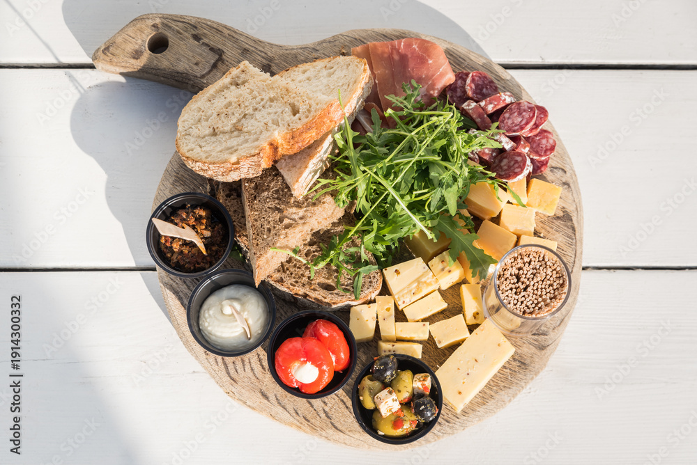 A wooden plank containing various bites and snacks such as cheese, ham, bread, olives, dips and peppers #1914300332