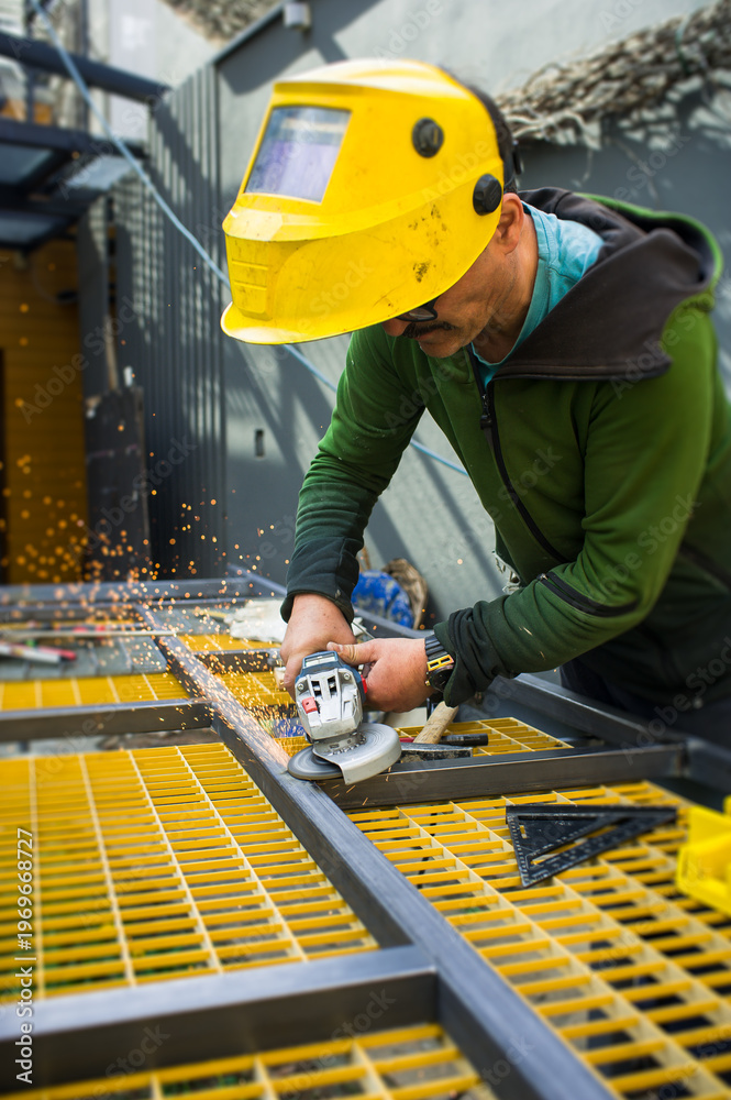 A worker cuts metal with a tool on a construction site. Sparks fly as he focuses on his task. The bright yellow grid beneath him adds color to the scene #1969668727