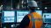 A worker in a safety vest and helmet monitors data on multiple screens in a high-tech industrial setting. #1291409002