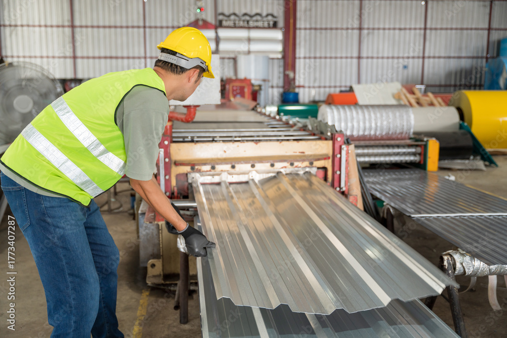 A Worker in reflective vest and hard hat manually guiding a finished corrugated metal sheet from the roll forming machine in a factory. #1773407287