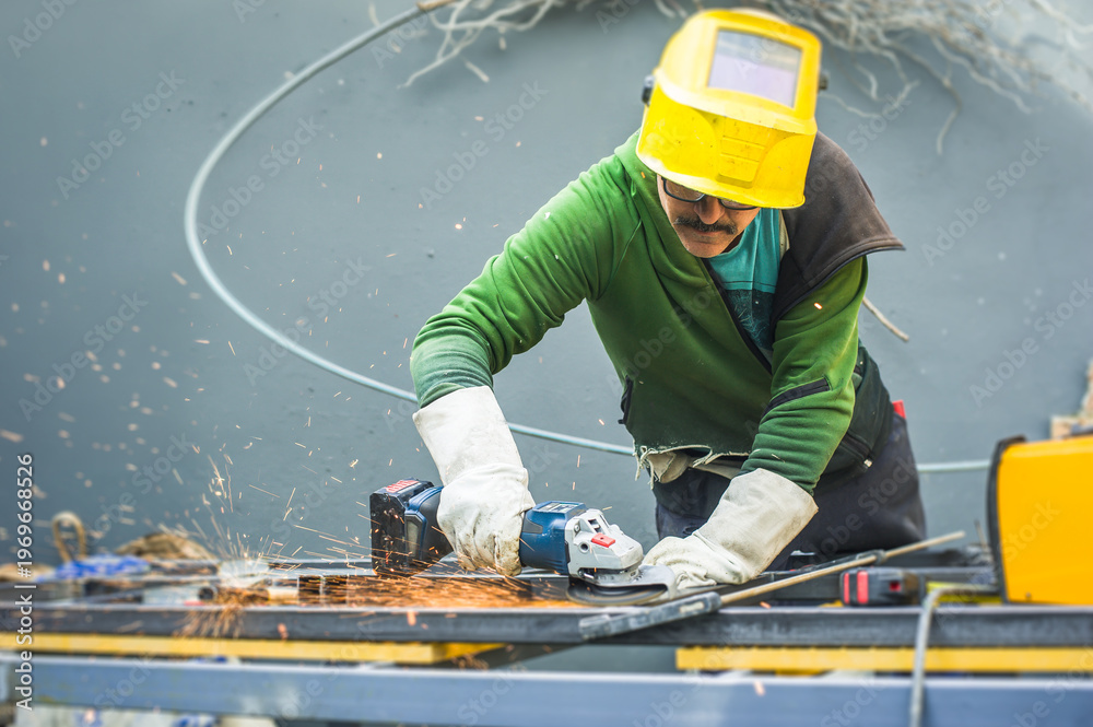 A worker is cutting metal in a workshop. The sparks fly as the tool grinds against the metal surface. The worker is wearing a safety helmet and gloves #1969668526