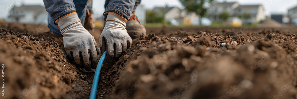 A worker's gloved hands lay a fiber optic cable in the ground #1926774026