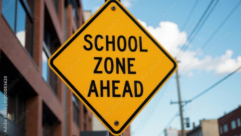 A yellow diamond-shaped school zone ahead sign on a street with buildings and power lines in the background. #1300083620