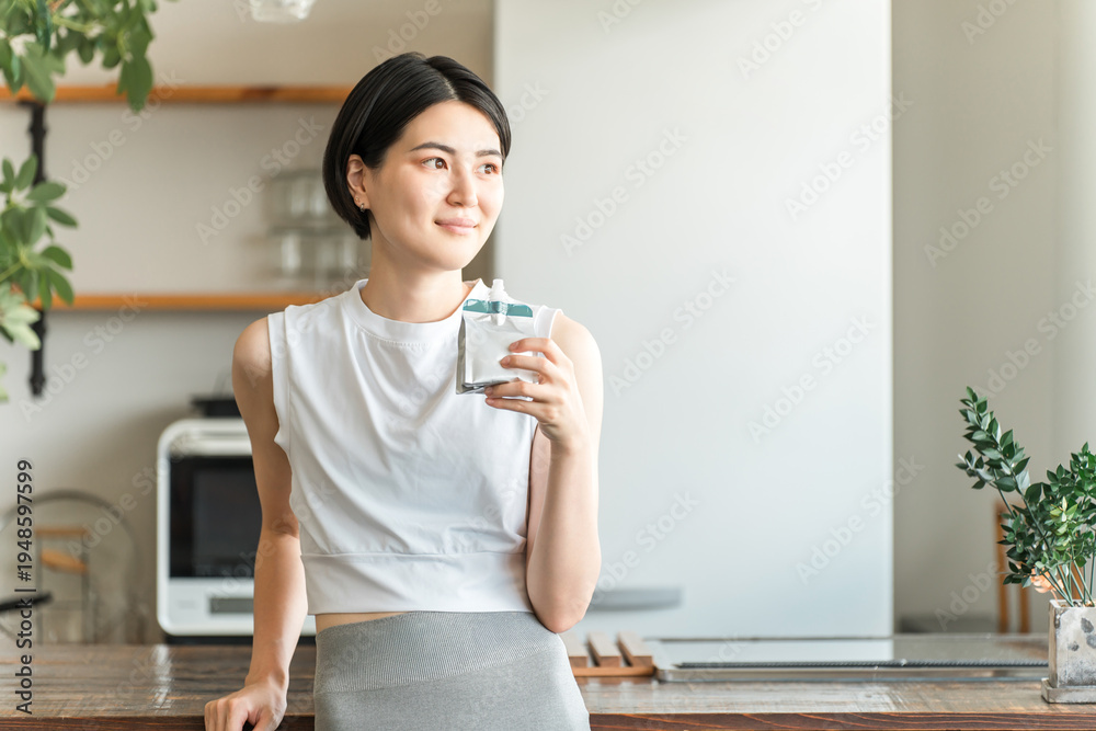 A young Asian woman in sportswear is shown consuming a jelly drink and nutritional supplement jelly. #1948597599