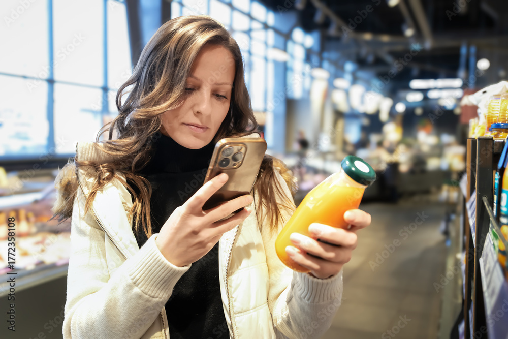 A young blonde white woman buys juice in a modern supermarket. She reads the label with her phone, scans it, and examines the ingredients. Healthy eating and healthy lifestyle. #1772358108