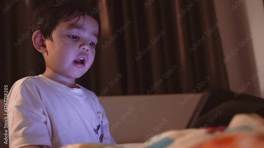 A young boy intensely focused on a digital tablet in a dimly lit bedroom, highlighting screen time and modern parenting. #1767718205
