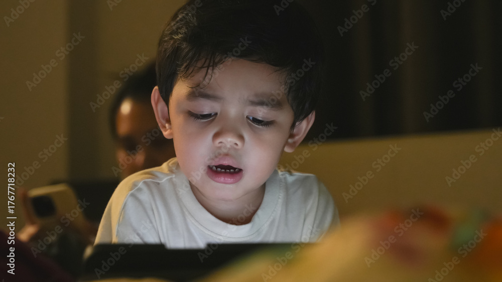 A young boy intensely focused on a digital tablet in a dimly lit bedroom, highlighting screen time and modern parenting. #1767718232