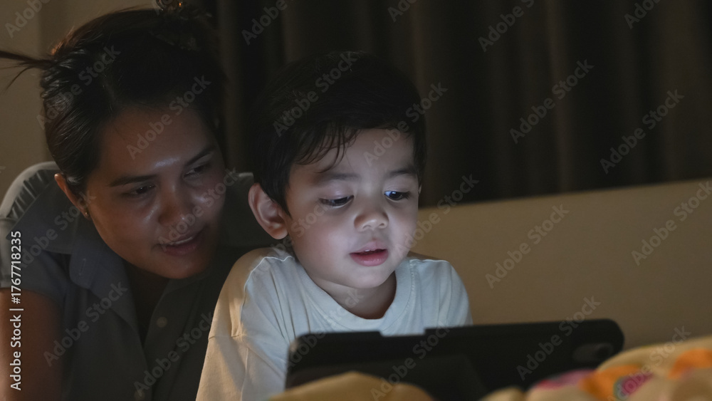 A young boy intensely focused on a digital tablet in a dimly lit bedroom, highlighting screen time and modern parenting. #1767718235