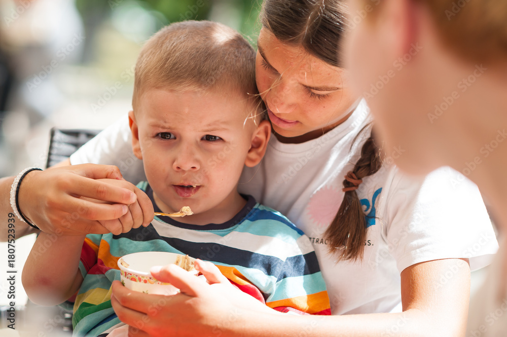 A young boy savoring a bowl of dessert is being lovingly fed by his older sister in a bright outdoor area. The sunlight creates a warm and cheerful atmosphere around them. #1807523939