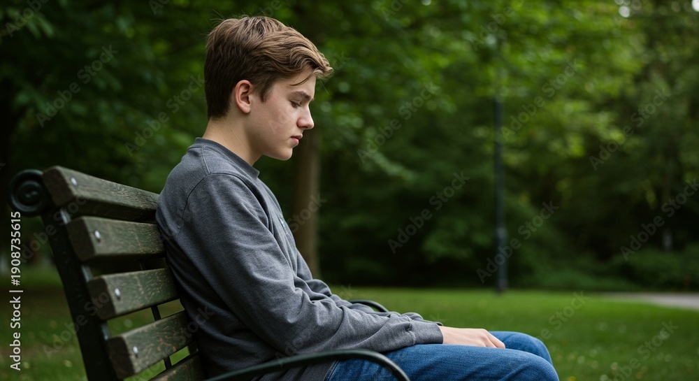 A young boy sits alone on a park bench looking sad and contemplative #1908735615