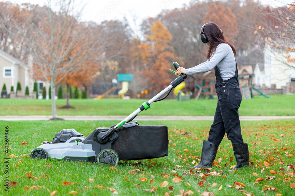a young caucasian woman wearing overalls and noise blockers is operating a lawnmover on grass in late autumn. There are fallen leaves and a suburban neighborhood setting in background. #471369946