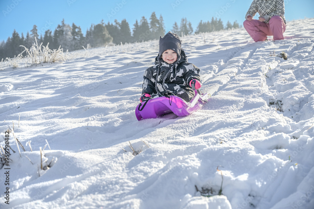 A young child sits relaxed on a bright sled, gazing innocently at the snowy landscape, capturing the essence of childhood wonder and joy in winter #1959790482