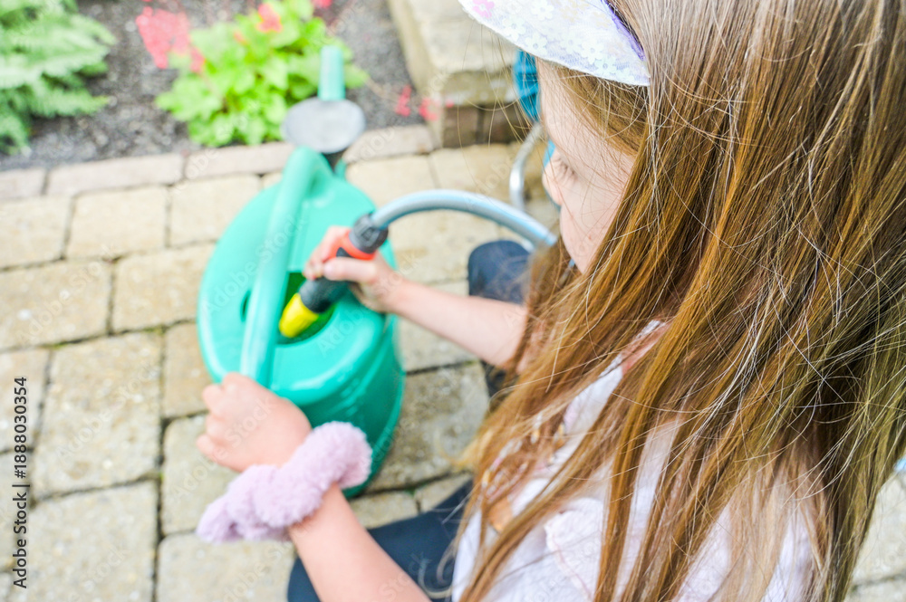 A young girl attentively fills a green watering can, focusing on gardening tasks with enthusiasm, portraying the joy of nurturing plants and understanding nature's beauty #1888030354