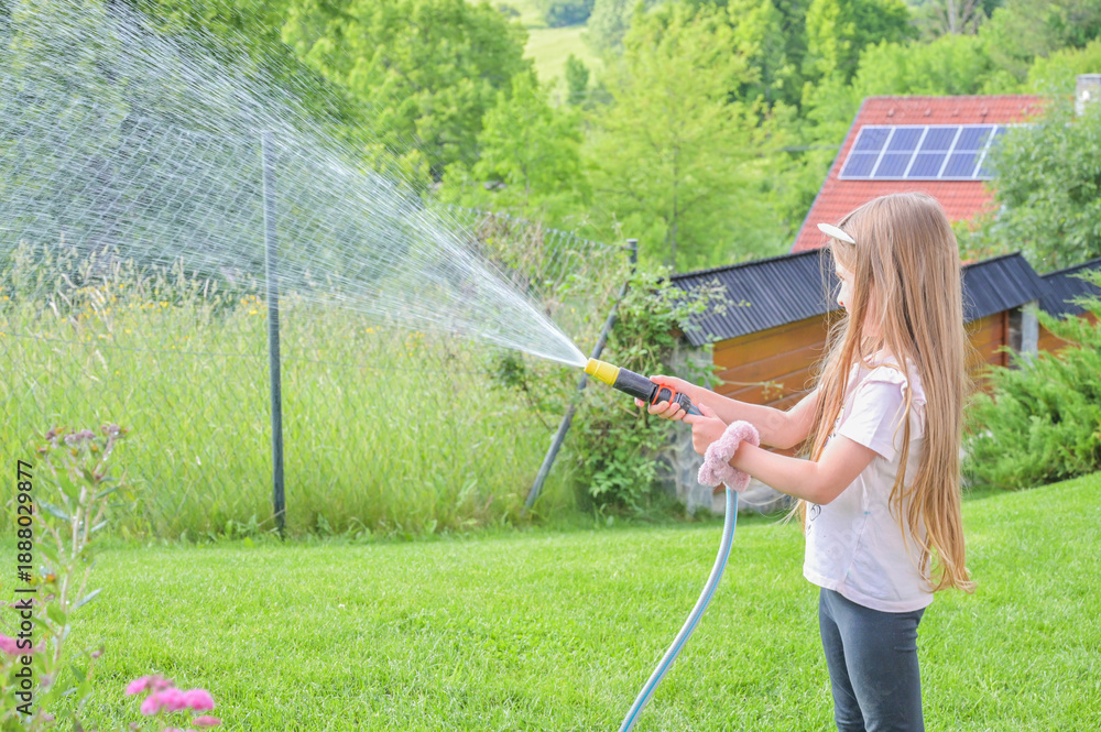 A young girl joyfully sprays water across her garden, capturing the essence of childhood play, joy, and the vitality of life through an engaging outdoor activity #1888029877