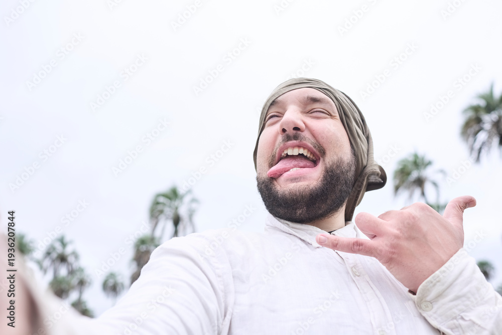 A young hispanic man with a playful expression sticking out his tongue takes a selfie outdoors during his vacation in a natural area in Entre Rios, Argentina. #1936207844