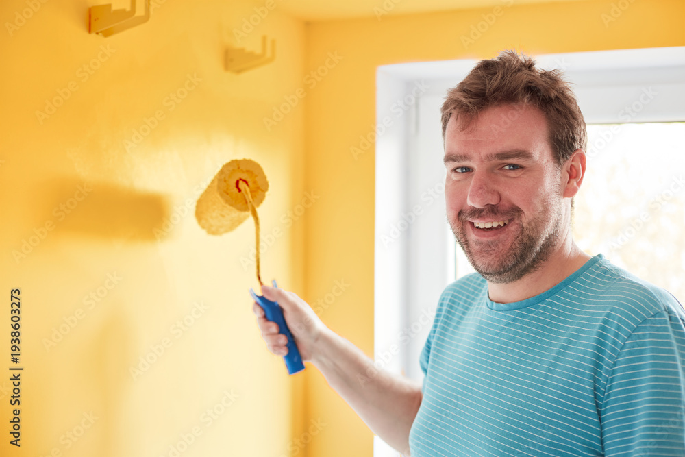 A young man in a blue shirt painting a wall yellow in a modern home. #1938603273