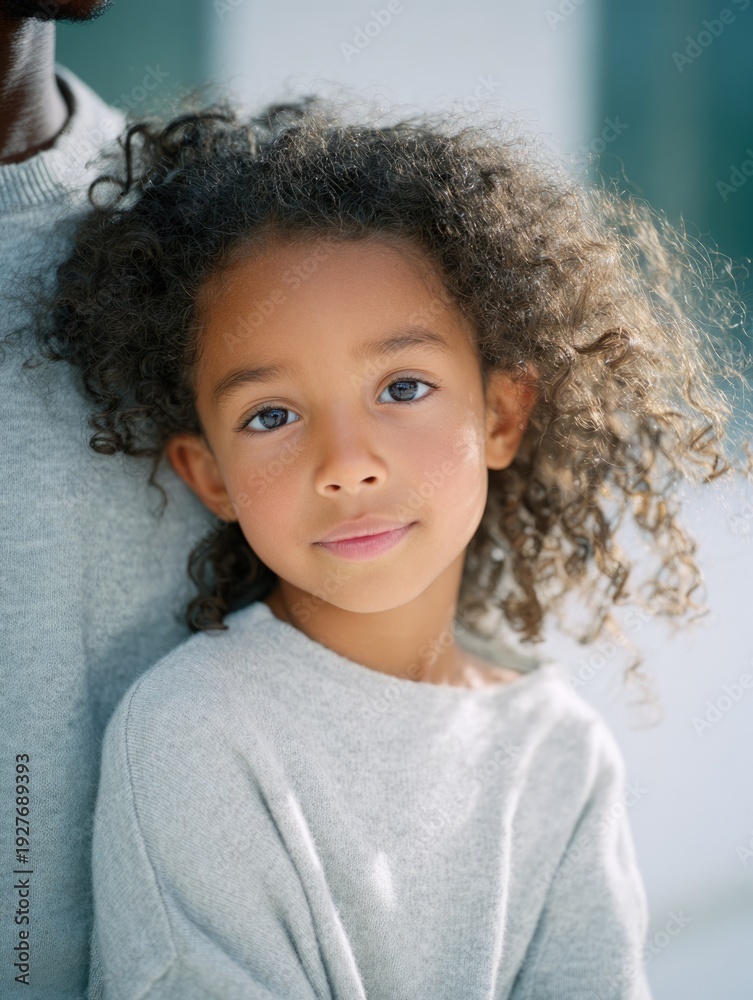 A young mixed-race girl with curly hair smiles softly. She wears a light gray sweater and stands close to an adult, showing a warm connection. #1927689393
