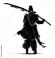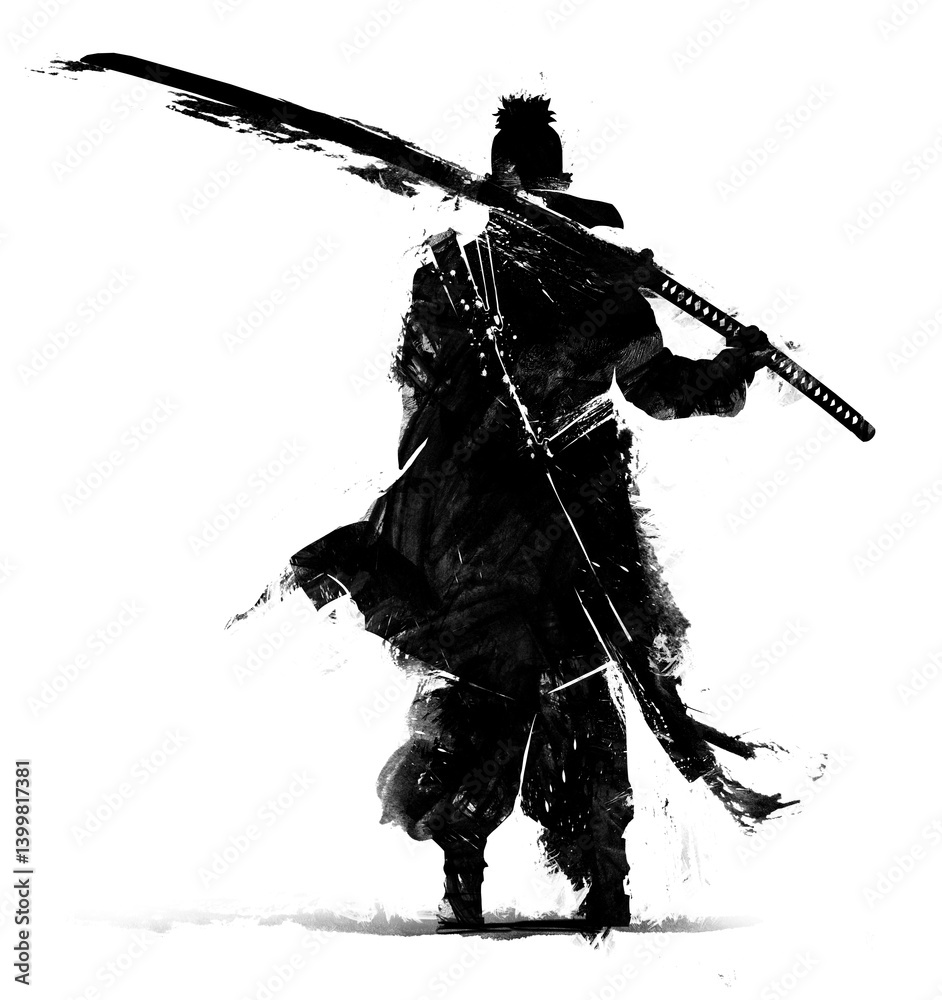 A young punk warrior with a long katana on his shoulder, he stands in an epic pose with his cape fluttering in the wind. Black silhouette view from the back. 2d art. Ink blots and splashes #1399817381