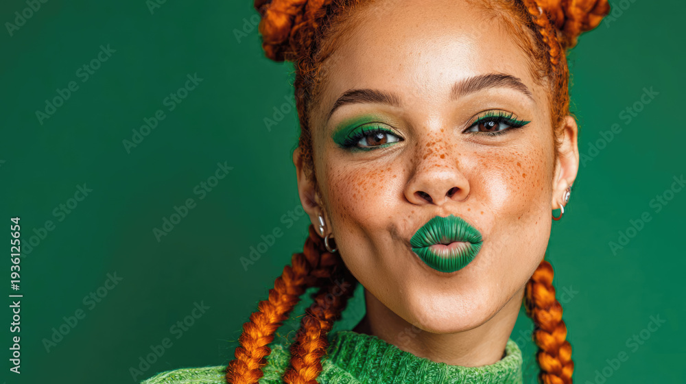 • #1936125674 A young smiling woman with orange braids and bright green makeup poses against a green background. St. Patrick's Day celebration concept, themed makeup