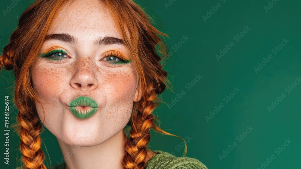 A young smiling woman with orange braids and bright green makeup poses against a green background. St. Patrick's Day celebration concept, themed makeup #1936125674