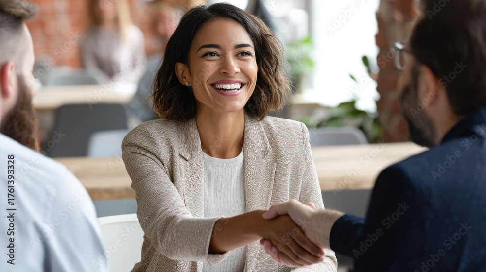 A young successful woman in a suit smiles and shakes hands with a client or partner in a modern office. Concept: closing a deal, concluding a contract, collaboration, business #1761393328