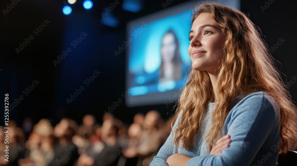 A young woman watching a TED Talk on innovation, inspired by the speaker words #1255392786