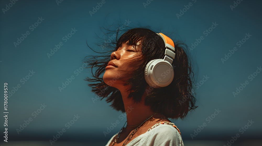 A young woman with eyes closed enjoying music with wireless headphones and the ocean breeze in summer air. #1780019570