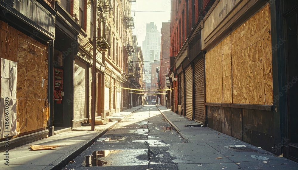Abandoned alley with boarded windows and yellow tape #1867670305