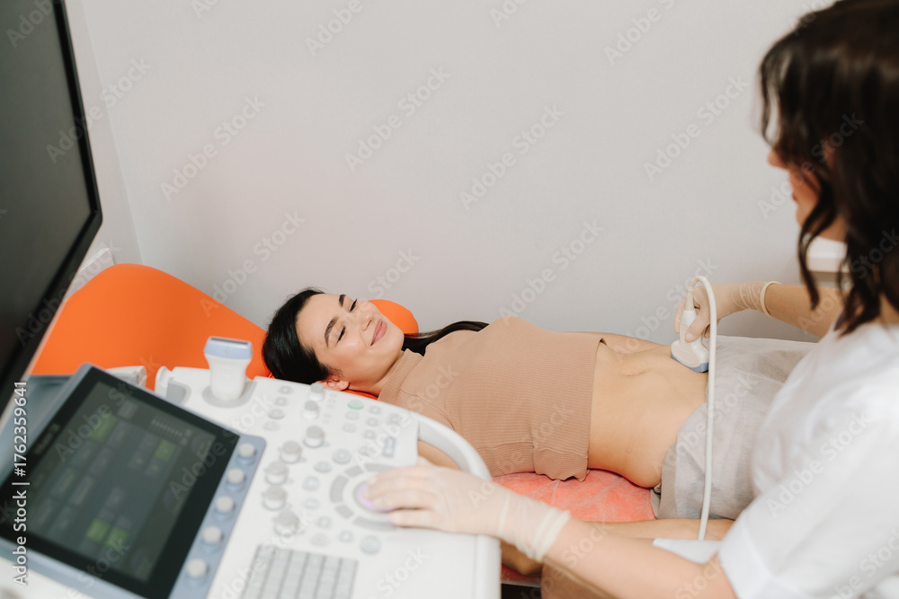 Abdominal ultrasound. Gynecologist uses ultrasound equipment for reproductive health evaluation. Gynecologist performs an abdominal ultrasound on a relaxed patient. #1762359641