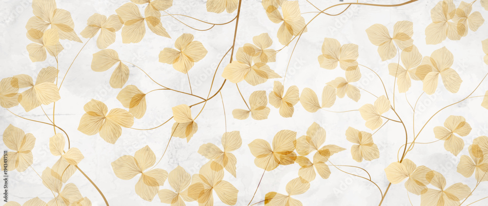 Abstract art background with transparent beige or gold leaves on a branch. Botanical banner for decor, prints, packaging, textiles, wallpaper, posters, and interior design. #1943497511