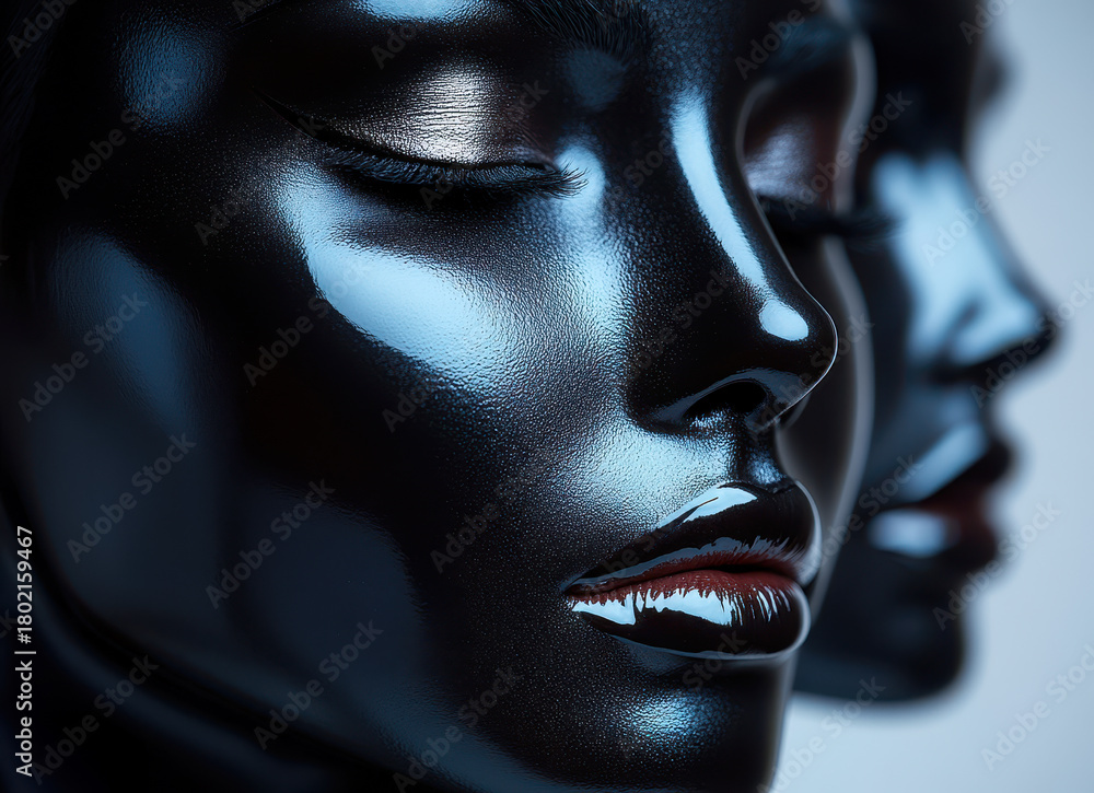 Abstract Artistic Sculpture of Glossy Black Mannequin Faces with Soft Light Reflections and Smooth Texture Close-Up #1802159467