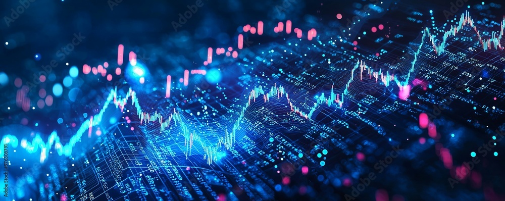 Abstract background with digital data and stock market charts on blue glowing lights, AI technology concept. #976308791