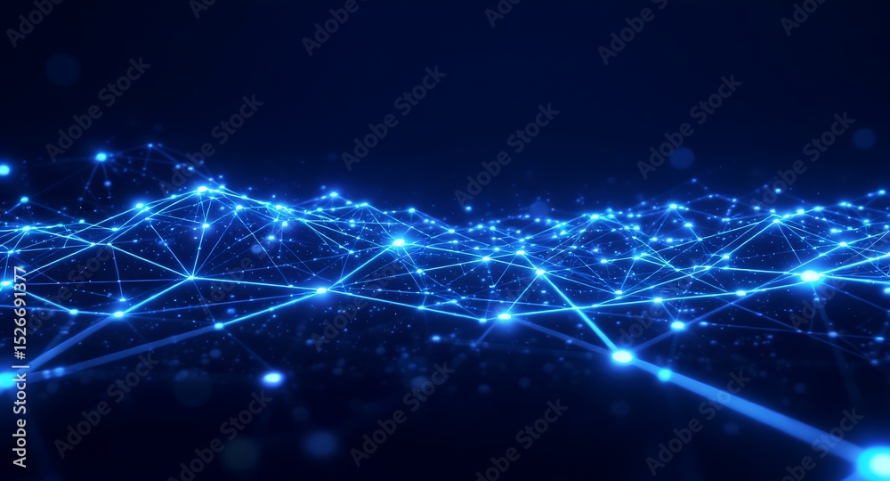 Abstract Blue Digital Network with Glowing Nodes and Connecting Lines on Dark Background Representing Technology and Data #1526691377