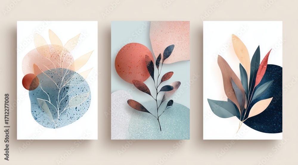Abstract Botanical Art: Three art prints feature colorful abstract shapes and botanical elements, evoking a sense of serene simplicity and artistic expression. #1712277008