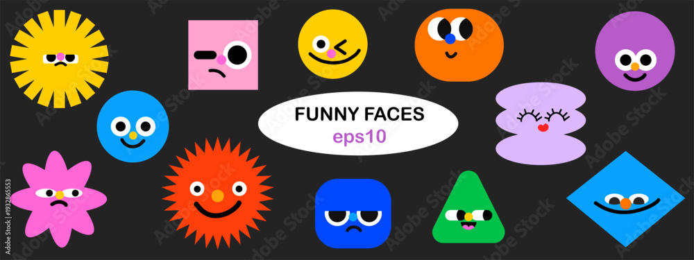 Abstract bright colorful geometric character cheerful face shapes. Doodle cute design emotion elements in cute style with mouth, eyes, different mood vector elements collection. #1932865553