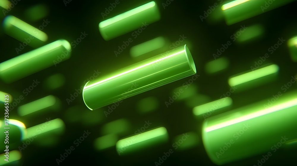 Abstract bright light streaks from cylindrical forms on a green background, creating a cinematic effect. #1733665125