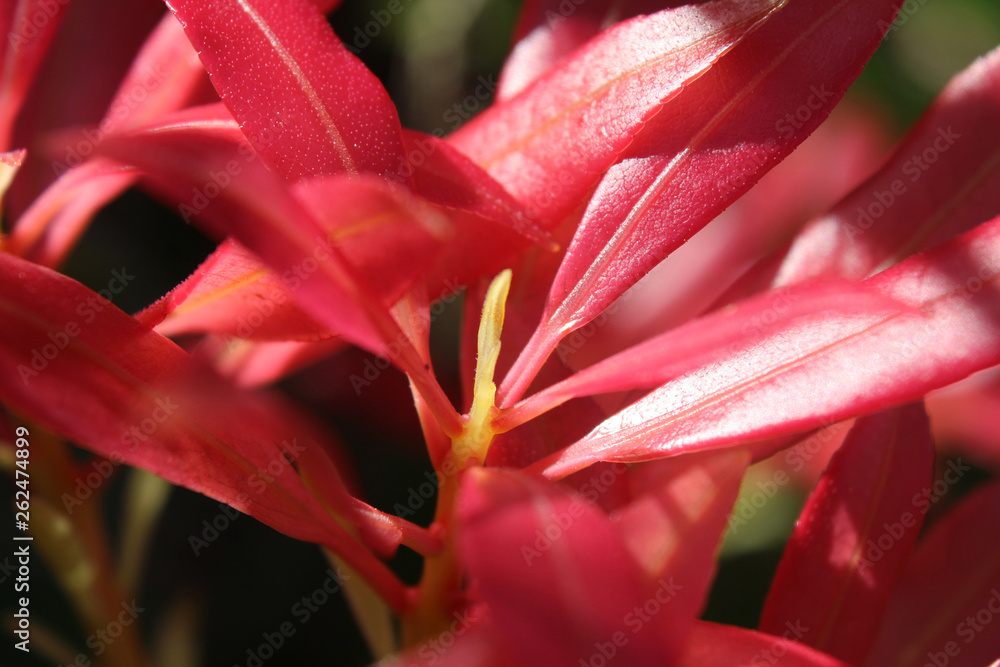 Abstract bright pink new spring growth of the Pieris japonica plant, also known as Flame of the Forest or Lilly of the Valley plant. #262474899