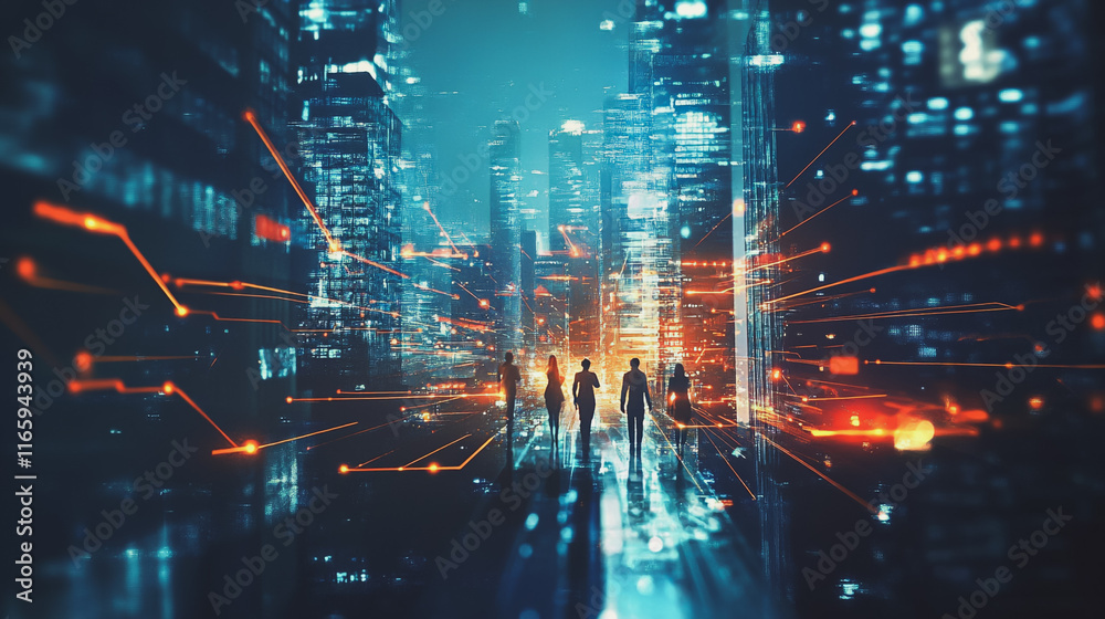 Abstract business team stands on the peak of success amid tall, innovative Smart city and graphs with statistics to analyze business potential and predict future developments in company growth. #1165943939