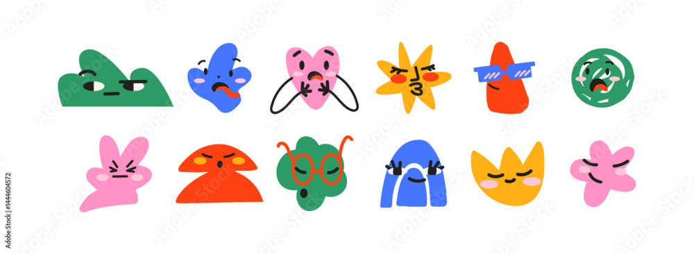 Abstract cartoon faces in retro cartoon style. Funny doodle characters with emotions: anger, surprise, sadness, joy. Colorful expressive shapes with facial expressions. Funky doodle mascots characters #1444604572