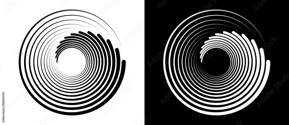Abstract circular spiral pattern with dynamic concentric lines. Minimalist vector illustration of swirling vortex shape isolated on black and white backgrounds. #1961255761