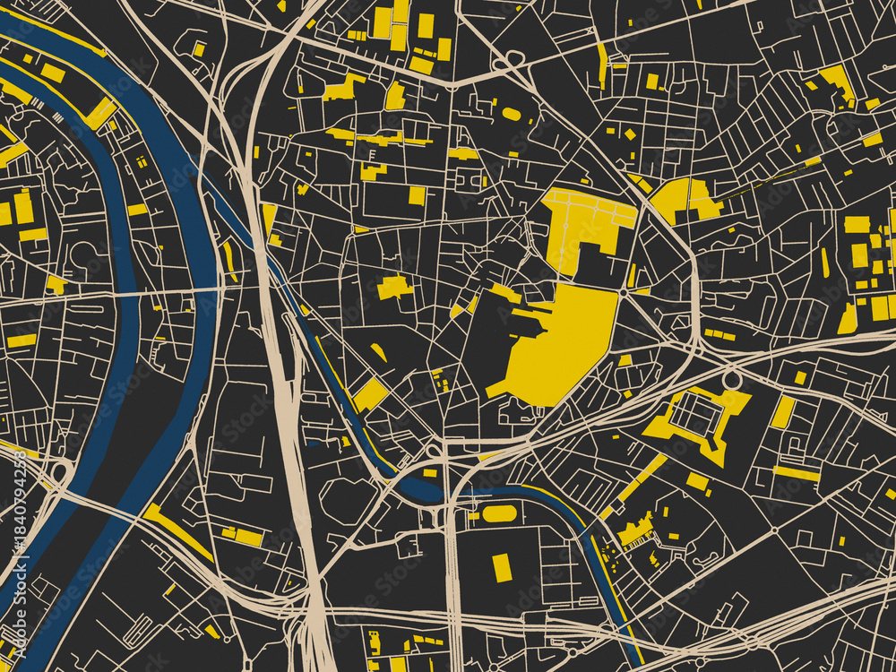 Abstract city map of Saint-Denis, France with dark map with yellow accents #1840794258