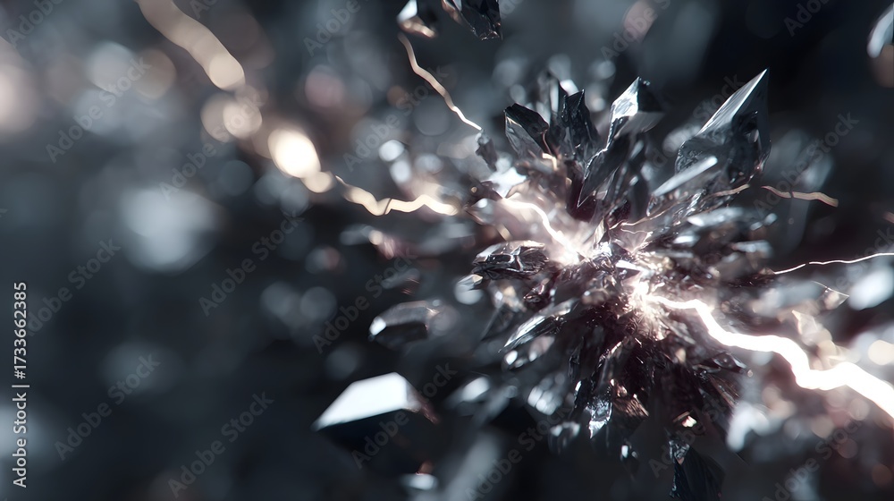 Abstract close-up of silver liquid metallic spikes emerging from molten metal with cinematic lightning effects. #1733662385